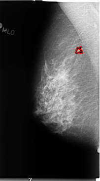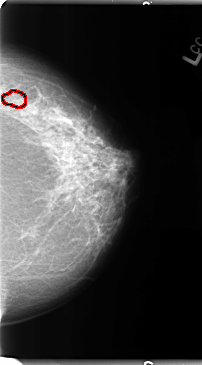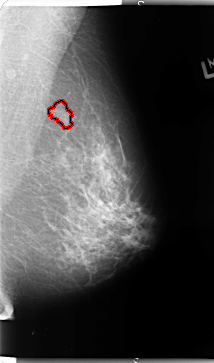 FILE: B_3096_1.LEFT_CC.OVERLAY TOTAL_ABNORMALITIES 1 ABNORMALITY 1 LESION_TYPE MASS SHAPE IRREGULAR MARGINS OBSCURED ASSESSMENT 3 SUBTLETY 2 PATHOLOGY BENIGN TOTAL_OUTLINES 1 BOUNDARY |