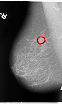 FILE: B_3113_1.RIGHT_CC.OVERLAY TOTAL_ABNORMALITIES 1 ABNORMALITY 1 LESION_TYPE MASS SHAPE ROUND MARGINS CIRCUMSCRIBED ASSESSMENT 3 SUBTLETY 4 PATHOLOGY BENIGN TOTAL_OUTLINES 1 BOUNDARY |