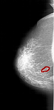 FILE: A_1123_1.LEFT_MLO.OVERLAY TOTAL_ABNORMALITIES 1 ABNORMALITY 1 LESION_TYPE CALCIFICATION TYPE PLEOMORPHIC DISTRIBUTION SEGMENTAL LESION_TYPE MASS SHAPE LOBULATED MARGINS ILL_DEFINED ASSESSMENT 4 SUBTLETY 4 PATHOLOGY BENIGN TOTAL_OUTLINES 1 BOUNDARY |