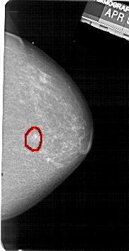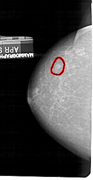 FILE: A_1435_1.RIGHT_CC.OVERLAY TOTAL_ABNORMALITIES 1 ABNORMALITY 1 LESION_TYPE MASS SHAPE OVAL MARGINS ILL_DEFINED ASSESSMENT 4 SUBTLETY 4 PATHOLOGY BENIGN TOTAL_OUTLINES 1 BOUNDARY |