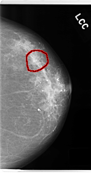 FILE: C_0283_1.LEFT_CC.OVERLAY TOTAL_ABNORMALITIES 1 ABNORMALITY 1 LESION_TYPE MASS SHAPE ARCHITECTURAL_DISTORTION MARGINS SPICULATED ASSESSMENT 4 SUBTLETY 5 PATHOLOGY BENIGN TOTAL_OUTLINES 1 BOUNDARY |
