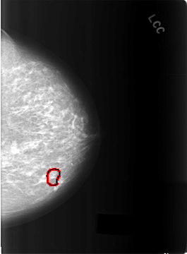 FILE: C_0288_1.LEFT_CC.OVERLAY TOTAL_ABNORMALITIES 1 ABNORMALITY 1 LESION_TYPE CALCIFICATION TYPE PLEOMORPHIC DISTRIBUTION CLUSTERED ASSESSMENT 4 SUBTLETY 4 PATHOLOGY BENIGN TOTAL_OUTLINES 1 BOUNDARY |