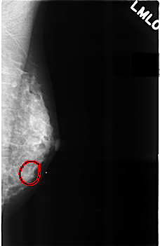 FILE: C_0289_1.LEFT_MLO.OVERLAY TOTAL_ABNORMALITIES 1 ABNORMALITY 1 LESION_TYPE MASS SHAPE ROUND MARGINS OBSCURED ASSESSMENT 4 SUBTLETY 2 PATHOLOGY BENIGN TOTAL_OUTLINES 1 BOUNDARY |