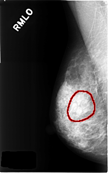 FILE: C_0314_1.RIGHT_CC.OVERLAY TOTAL_ABNORMALITIES 1 ABNORMALITY 1 LESION_TYPE MASS SHAPE LOBULATED MARGINS OBSCURED ASSESSMENT 3 SUBTLETY 4 PATHOLOGY BENIGN TOTAL_OUTLINES 1 BOUNDARY |