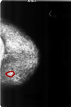 FILE: B_3357_1.LEFT_CC.OVERLAY TOTAL_ABNORMALITIES 1 ABNORMALITY 1 LESION_TYPE MASS SHAPE LOBULATED MARGINS CIRCUMSCRIBED ASSESSMENT 3 SUBTLETY 3 PATHOLOGY BENIGN TOTAL_OUTLINES 1 BOUNDARY |