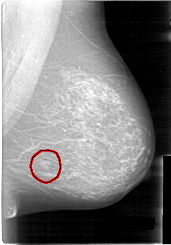 FILE: D_4014_1.LEFT_CC.OVERLAY TOTAL_ABNORMALITIES 1 ABNORMALITY 1 LESION_TYPE MASS SHAPE LOBULATED MARGINS OBSCURED ASSESSMENT 0 SUBTLETY 5 PATHOLOGY BENIGN TOTAL_OUTLINES 1 BOUNDARY |