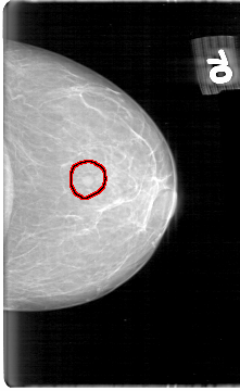 FILE: D_4060_1.LEFT_CC.OVERLAY TOTAL_ABNORMALITIES 1 ABNORMALITY 1 LESION_TYPE MASS SHAPE ROUND MARGINS OBSCURED ASSESSMENT 0 SUBTLETY 4 PATHOLOGY BENIGN TOTAL_OUTLINES 1 BOUNDARY |