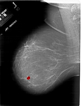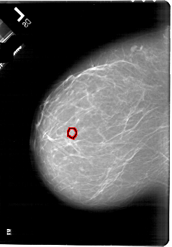 FILE: A_1818_1.LEFT_MLO.OVERLAY TOTAL_ABNORMALITIES 1 ABNORMALITY 1 LESION_TYPE CALCIFICATION TYPE PLEOMORPHIC DISTRIBUTION CLUSTERED ASSESSMENT 4 SUBTLETY 1 PATHOLOGY BENIGN TOTAL_OUTLINES 1 BOUNDARY |