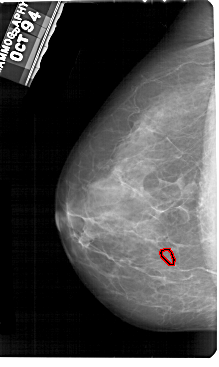 FILE: A_1945_1.LEFT_MLO.OVERLAY TOTAL_ABNORMALITIES 1 ABNORMALITY 1 LESION_TYPE CALCIFICATION TYPE PLEOMORPHIC DISTRIBUTION CLUSTERED ASSESSMENT 4 SUBTLETY 2 PATHOLOGY BENIGN TOTAL_OUTLINES 1 BOUNDARY |