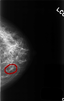 FILE: C_0507_1.LEFT_CC.OVERLAY TOTAL_ABNORMALITIES 1 ABNORMALITY 1 LESION_TYPE MASS SHAPE LOBULATED MARGINS CIRCUMSCRIBED ASSESSMENT 3 SUBTLETY 5 PATHOLOGY BENIGN TOTAL_OUTLINES 1 BOUNDARY |