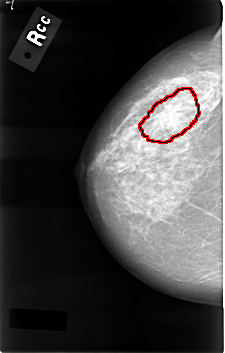 FILE: C_0001_1.RIGHT_CC.OVERLAY TOTAL_ABNORMALITIES 1 ABNORMALITY 1 LESION_TYPE MASS SHAPE IRREGULAR MARGINS SPICULATED ASSESSMENT 5 SUBTLETY 5 PATHOLOGY MALIGNANT TOTAL_OUTLINES 1 BOUNDARY |