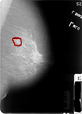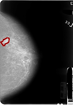 FILE: B_3046_1.LEFT_CC.OVERLAY TOTAL_ABNORMALITIES 1 ABNORMALITY 1 LESION_TYPE MASS SHAPE IRREGULAR MARGINS SPICULATED ASSESSMENT 4 SUBTLETY 3 PATHOLOGY MALIGNANT TOTAL_OUTLINES 1 BOUNDARY |