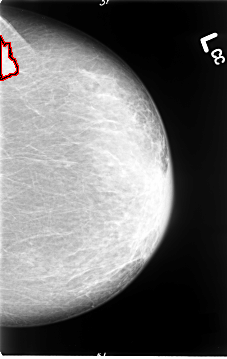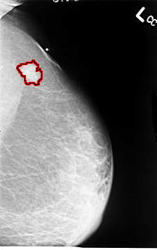 FILE: B_3064_1.LEFT_CC.OVERLAY TOTAL_ABNORMALITIES 1 ABNORMALITY 1 LESION_TYPE MASS SHAPE IRREGULAR MARGINS SPICULATED ASSESSMENT 4 SUBTLETY 4 PATHOLOGY MALIGNANT TOTAL_OUTLINES 1 BOUNDARY |