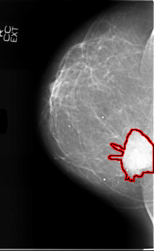 FILE: B_3065_1.RIGHT_CC.OVERLAY TOTAL_ABNORMALITIES 1 ABNORMALITY 1 LESION_TYPE CALCIFICATION TYPE PLEOMORPHIC DISTRIBUTION CLUSTERED LESION_TYPE MASS SHAPE IRREGULAR MARGINS SPICULATED ASSESSMENT 5 SUBTLETY 5 PATHOLOGY MALIGNANT TOTAL_OUTLINES 1 BOUNDARY |