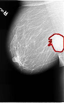 FILE: B_3065_1.RIGHT_MLO.OVERLAY TOTAL_ABNORMALITIES 1 ABNORMALITY 1 LESION_TYPE CALCIFICATION TYPE PLEOMORPHIC DISTRIBUTION CLUSTERED LESION_TYPE MASS SHAPE IRREGULAR MARGINS SPICULATED ASSESSMENT 5 SUBTLETY 5 PATHOLOGY MALIGNANT TOTAL_OUTLINES 1 BOUNDARY |