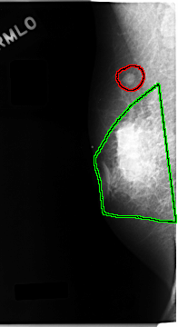 FILE: C_0061_1.RIGHT_MLO.OVERLAY TOTAL_ABNORMALITIES 2 ABNORMALITY 1 LESION_TYPE MASS SHAPE ROUND MARGINS CIRCUMSCRIBED ASSESSMENT 5 SUBTLETY 5 PATHOLOGY MALIGNANT TOTAL_OUTLINES 1 BOUNDARY ABNORMALITY 2 LESION_TYPE MASS SHAPE IRREGULAR MARGINS SPICULATED ASSESSMENT 5 SUBTLETY 5 PATHOLOGY MALIGNANT TOTAL_OUTLINES 1 BOUNDARY |