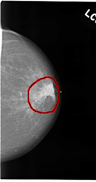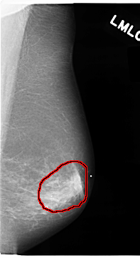 FILE: C_0074_1.LEFT_CC.OVERLAY TOTAL_ABNORMALITIES 1 ABNORMALITY 1 LESION_TYPE MASS SHAPE IRREGULAR MARGINS SPICULATED ASSESSMENT 5 SUBTLETY 5 PATHOLOGY MALIGNANT TOTAL_OUTLINES 1 BOUNDARY |