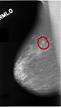 FILE: C_0096_1.RIGHT_MLO.OVERLAY TOTAL_ABNORMALITIES 1 ABNORMALITY 1 LESION_TYPE CALCIFICATION TYPE PLEOMORPHIC DISTRIBUTION CLUSTERED LESION_TYPE MASS SHAPE IRREGULAR MARGINS SPICULATED ASSESSMENT 5 SUBTLETY 5 PATHOLOGY MALIGNANT TOTAL_OUTLINES 1 BOUNDARY |