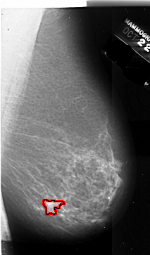 FILE: A_1008_1.RIGHT_CC.OVERLAY TOTAL_ABNORMALITIES 1 ABNORMALITY 1 LESION_TYPE MASS SHAPE IRREGULAR MARGINS ILL_DEFINED ASSESSMENT 4 SUBTLETY 4 PATHOLOGY MALIGNANT TOTAL_OUTLINES 1 BOUNDARY |