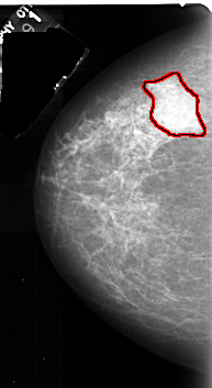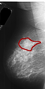FILE: A_1036_1.LEFT_CC.OVERLAY TOTAL_ABNORMALITIES 1 ABNORMALITY 1 LESION_TYPE MASS SHAPE IRREGULAR MARGINS ILL_DEFINED ASSESSMENT 4 SUBTLETY 5 PATHOLOGY MALIGNANT TOTAL_OUTLINES 1 BOUNDARY |