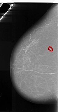 FILE: A_1073_1.LEFT_MLO.OVERLAY TOTAL_ABNORMALITIES 1 ABNORMALITY 1 LESION_TYPE CALCIFICATION TYPE PLEOMORPHIC DISTRIBUTION CLUSTERED LESION_TYPE MASS SHAPE IRREGULAR MARGINS ILL_DEFINED ASSESSMENT 4 SUBTLETY 3 PATHOLOGY MALIGNANT TOTAL_OUTLINES 1 BOUNDARY |