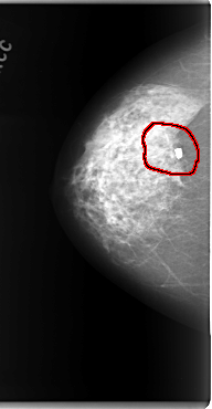 FILE: C_0085_1.RIGHT_CC.OVERLAY TOTAL_ABNORMALITIES 1 ABNORMALITY 1 LESION_TYPE MASS SHAPE IRREGULAR MARGINS SPICULATED ASSESSMENT 5 SUBTLETY 4 PATHOLOGY MALIGNANT TOTAL_OUTLINES 1 BOUNDARY |