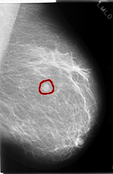 FILE: C_0164_1.LEFT_CC.OVERLAY TOTAL_ABNORMALITIES 1 ABNORMALITY 1 LESION_TYPE MASS SHAPE OVAL MARGINS CIRCUMSCRIBED ASSESSMENT 4 SUBTLETY 5 PATHOLOGY MALIGNANT TOTAL_OUTLINES 1 BOUNDARY |