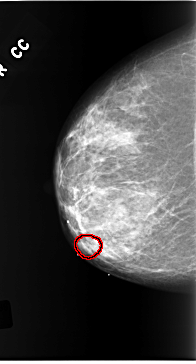 FILE: C_0168_1.RIGHT_CC.OVERLAY TOTAL_ABNORMALITIES 1 ABNORMALITY 1 LESION_TYPE MASS SHAPE OVAL MARGINS OBSCURED ASSESSMENT 4 SUBTLETY 2 PATHOLOGY MALIGNANT TOTAL_OUTLINES 1 BOUNDARY |
