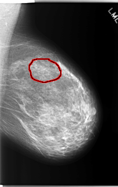 FILE: C_0207_1.LEFT_CC.OVERLAY TOTAL_ABNORMALITIES 1 ABNORMALITY 1 LESION_TYPE CALCIFICATION TYPE PLEOMORPHIC DISTRIBUTION CLUSTERED LESION_TYPE MASS SHAPE IRREGULAR MARGINS SPICULATED ASSESSMENT 4 SUBTLETY 4 PATHOLOGY MALIGNANT TOTAL_OUTLINES 1 BOUNDARY |