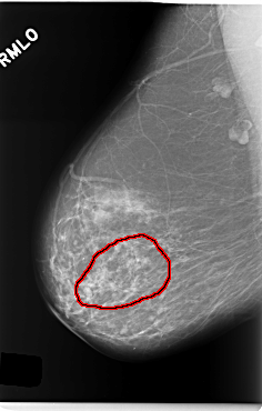 FILE: C_0214_1.RIGHT_MLO.OVERLAY TOTAL_ABNORMALITIES 1 ABNORMALITY 1 LESION_TYPE CALCIFICATION TYPE PLEOMORPHIC DISTRIBUTION SEGMENTAL ASSESSMENT 4 SUBTLETY 4 PATHOLOGY MALIGNANT TOTAL_OUTLINES 1 BOUNDARY |