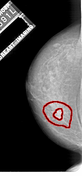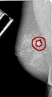 FILE: A_1112_1.LEFT_CC.OVERLAY TOTAL_ABNORMALITIES 1 ABNORMALITY 1 LESION_TYPE MASS SHAPE IRREGULAR MARGINS SPICULATED ASSESSMENT 5 SUBTLETY 5 PATHOLOGY MALIGNANT TOTAL_OUTLINES 2 BOUNDARY CORE |