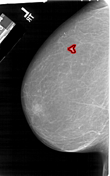 FILE: A_1204_1.LEFT_CC.OVERLAY TOTAL_ABNORMALITIES 1 ABNORMALITY 1 LESION_TYPE MASS SHAPE IRREGULAR MARGINS ILL_DEFINED ASSESSMENT 4 SUBTLETY 3 PATHOLOGY MALIGNANT TOTAL_OUTLINES 1 BOUNDARY |