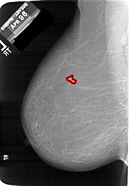 FILE: A_1204_1.LEFT_MLO.OVERLAY TOTAL_ABNORMALITIES 1 ABNORMALITY 1 LESION_TYPE MASS SHAPE IRREGULAR MARGINS ILL_DEFINED ASSESSMENT 4 SUBTLETY 3 PATHOLOGY MALIGNANT TOTAL_OUTLINES 1 BOUNDARY |