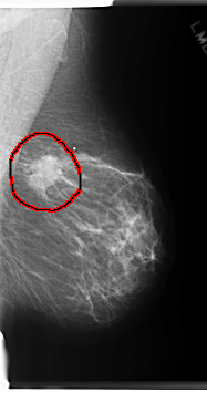 FILE: C_0220_1.LEFT_CC.OVERLAY TOTAL_ABNORMALITIES 1 ABNORMALITY 1 LESION_TYPE CALCIFICATION TYPE AMORPHOUS DISTRIBUTION CLUSTERED LESION_TYPE MASS SHAPE IRREGULAR MARGINS SPICULATED ASSESSMENT 5 SUBTLETY 5 PATHOLOGY MALIGNANT TOTAL_OUTLINES 1 BOUNDARY |