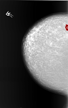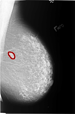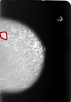FILE: B_3405_1.LEFT_CC.OVERLAY TOTAL_ABNORMALITIES 1 ABNORMALITY 1 LESION_TYPE MASS SHAPE LOBULATED MARGINS CIRCUMSCRIBED ASSESSMENT 4 SUBTLETY 5 PATHOLOGY BENIGN TOTAL_OUTLINES 1 BOUNDARY |