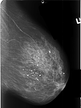 FILE: B_3411_1.RIGHT_CC.OVERLAY TOTAL_ABNORMALITIES 1 ABNORMALITY 1 LESION_TYPE CALCIFICATION TYPE N/A DISTRIBUTION LINEAR LESION_TYPE MASS SHAPE IRREGULAR MARGINS ILL_DEFINED-SPICULATED ASSESSMENT 5 SUBTLETY 5 PATHOLOGY MALIGNANT TOTAL_OUTLINES 1 BOUNDARY |