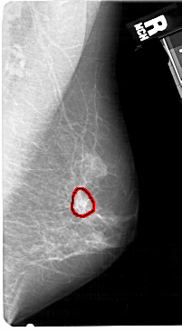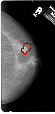 FILE: A_1520_1.RIGHT_MLO.OVERLAY TOTAL_ABNORMALITIES 1 ABNORMALITY 1 LESION_TYPE CALCIFICATION TYPE PLEOMORPHIC DISTRIBUTION CLUSTERED LESION_TYPE MASS SHAPE IRREGULAR MARGINS SPICULATED ASSESSMENT 4 SUBTLETY 3 PATHOLOGY MALIGNANT TOTAL_OUTLINES 1 BOUNDARY |