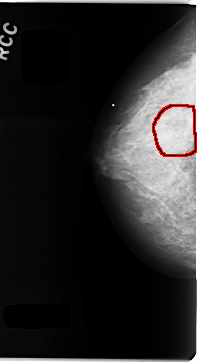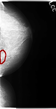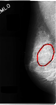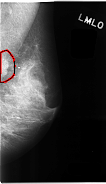 FILE: C_0107_1.LEFT_CC.OVERLAY TOTAL_ABNORMALITIES 1 ABNORMALITY 1 LESION_TYPE MASS SHAPE OVAL MARGINS ILL_DEFINED ASSESSMENT 5 SUBTLETY 2 PATHOLOGY MALIGNANT TOTAL_OUTLINES 1 BOUNDARY |