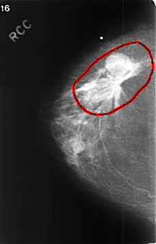 FILE: C_0457_1.RIGHT_CC.OVERLAY TOTAL_ABNORMALITIES 1 ABNORMALITY 1 LESION_TYPE MASS SHAPE IRREGULAR MARGINS SPICULATED ASSESSMENT 5 SUBTLETY 5 PATHOLOGY MALIGNANT TOTAL_OUTLINES 2 BOUNDARY |