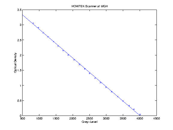Here is a plot of mean grey level versus the measured optical density of the step wedge phantom.