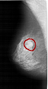 FILE: A_1396_1.LEFT_CC.OVERLAY TOTAL_ABNORMALITIES 1 ABNORMALITY 1 LESION_TYPE MASS SHAPE ROUND MARGINS OBSCURED ASSESSMENT 4 SUBTLETY 3 PATHOLOGY BENIGN TOTAL_OUTLINES 1 BOUNDARY |