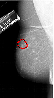 FILE: A_1435_1.RIGHT_CC.OVERLAY TOTAL_ABNORMALITIES 1 ABNORMALITY 1 LESION_TYPE MASS SHAPE OVAL MARGINS ILL_DEFINED ASSESSMENT 4 SUBTLETY 4 PATHOLOGY BENIGN TOTAL_OUTLINES 1 BOUNDARY |