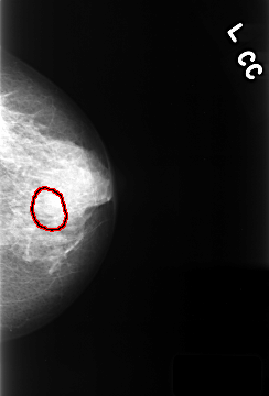 FILE: C_0395_1.LEFT_CC.OVERLAY TOTAL_ABNORMALITIES 1 ABNORMALITY 1 LESION_TYPE MASS SHAPE LOBULATED MARGINS CIRCUMSCRIBED ASSESSMENT 3 SUBTLETY 4 PATHOLOGY BENIGN TOTAL_OUTLINES 1 BOUNDARY |
