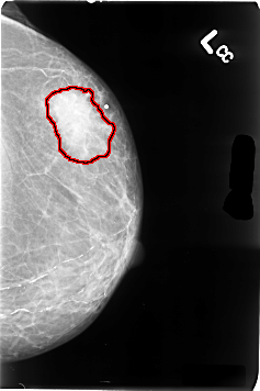 FILE: B_3041_1.LEFT_CC.OVERLAY TOTAL_ABNORMALITIES 1 ABNORMALITY 1 LESION_TYPE CALCIFICATION TYPE PLEOMORPHIC DISTRIBUTION CLUSTERED-LINEAR LESION_TYPE MASS SHAPE IRREGULAR MARGINS ILL_DEFINED-SPICULATED ASSESSMENT 5 SUBTLETY 5 PATHOLOGY MALIGNANT TOTAL_OUTLINES 1 BOUNDARY |