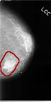 FILE: C_0050_1.LEFT_CC.OVERLAY TOTAL_ABNORMALITIES 1 ABNORMALITY 1 LESION_TYPE MASS SHAPE IRREGULAR MARGINS SPICULATED ASSESSMENT 5 SUBTLETY 5 PATHOLOGY MALIGNANT TOTAL_OUTLINES 1 BOUNDARY |
