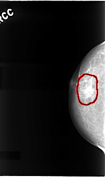 FILE: C_0069_1.RIGHT_CC.OVERLAY TOTAL_ABNORMALITIES 1 ABNORMALITY 1 LESION_TYPE MASS SHAPE IRREGULAR MARGINS SPICULATED ASSESSMENT 5 SUBTLETY 5 PATHOLOGY MALIGNANT TOTAL_OUTLINES 1 BOUNDARY |