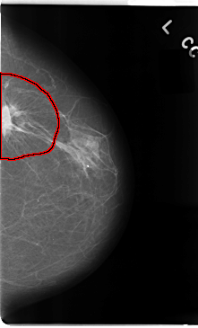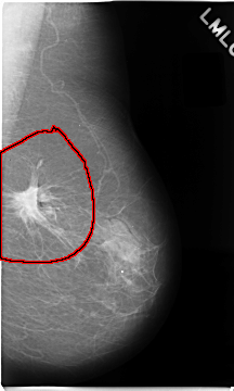 FILE: C_0079_1.LEFT_CC.OVERLAY TOTAL_ABNORMALITIES 1 ABNORMALITY 1 LESION_TYPE MASS SHAPE IRREGULAR MARGINS SPICULATED ASSESSMENT 5 SUBTLETY 5 PATHOLOGY MALIGNANT TOTAL_OUTLINES 1 BOUNDARY |