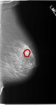 FILE: C_0093_1.LEFT_CC.OVERLAY TOTAL_ABNORMALITIES 1 ABNORMALITY 1 LESION_TYPE CALCIFICATION TYPE AMORPHOUS DISTRIBUTION CLUSTERED ASSESSMENT 5 SUBTLETY 4 PATHOLOGY MALIGNANT TOTAL_OUTLINES 1 BOUNDARY |