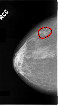 FILE: C_0096_1.RIGHT_CC.OVERLAY TOTAL_ABNORMALITIES 1 ABNORMALITY 1 LESION_TYPE CALCIFICATION TYPE PLEOMORPHIC DISTRIBUTION CLUSTERED LESION_TYPE MASS SHAPE IRREGULAR MARGINS ILL_DEFINED ASSESSMENT 5 SUBTLETY 4 PATHOLOGY MALIGNANT TOTAL_OUTLINES 1 BOUNDARY |