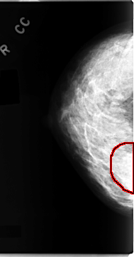 FILE: C_0098_1.RIGHT_CC.OVERLAY TOTAL_ABNORMALITIES 1 ABNORMALITY 1 LESION_TYPE MASS SHAPE IRREGULAR MARGINS ILL_DEFINED ASSESSMENT 4 SUBTLETY 3 PATHOLOGY MALIGNANT TOTAL_OUTLINES 1 BOUNDARY |